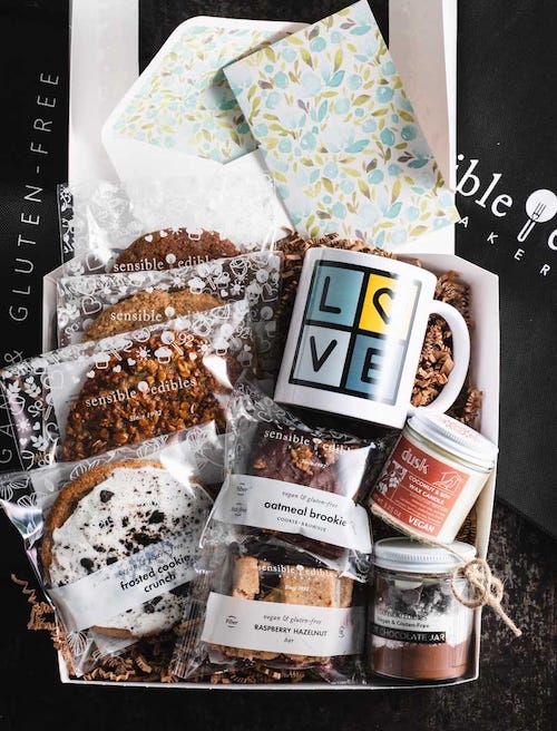 One of my favorite gluten-free bakeries in NYC, Sensible Edibles, offers gorgeous gift boxes that are perfect for the holidays. The Warmth & Wellness Gift Box features a variety of their delicious gluten-free, nut-free, and vegan baked goods as well as a homemade hot chocolate jar, vegan essential oil candle, and custom mug.