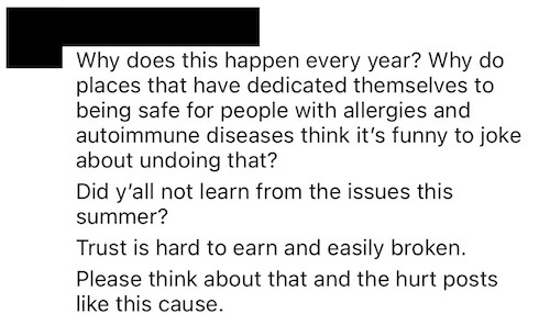 When these companies joke about adding gluten to their products, even momentarily, that erodes that trust and makes light of something serious.